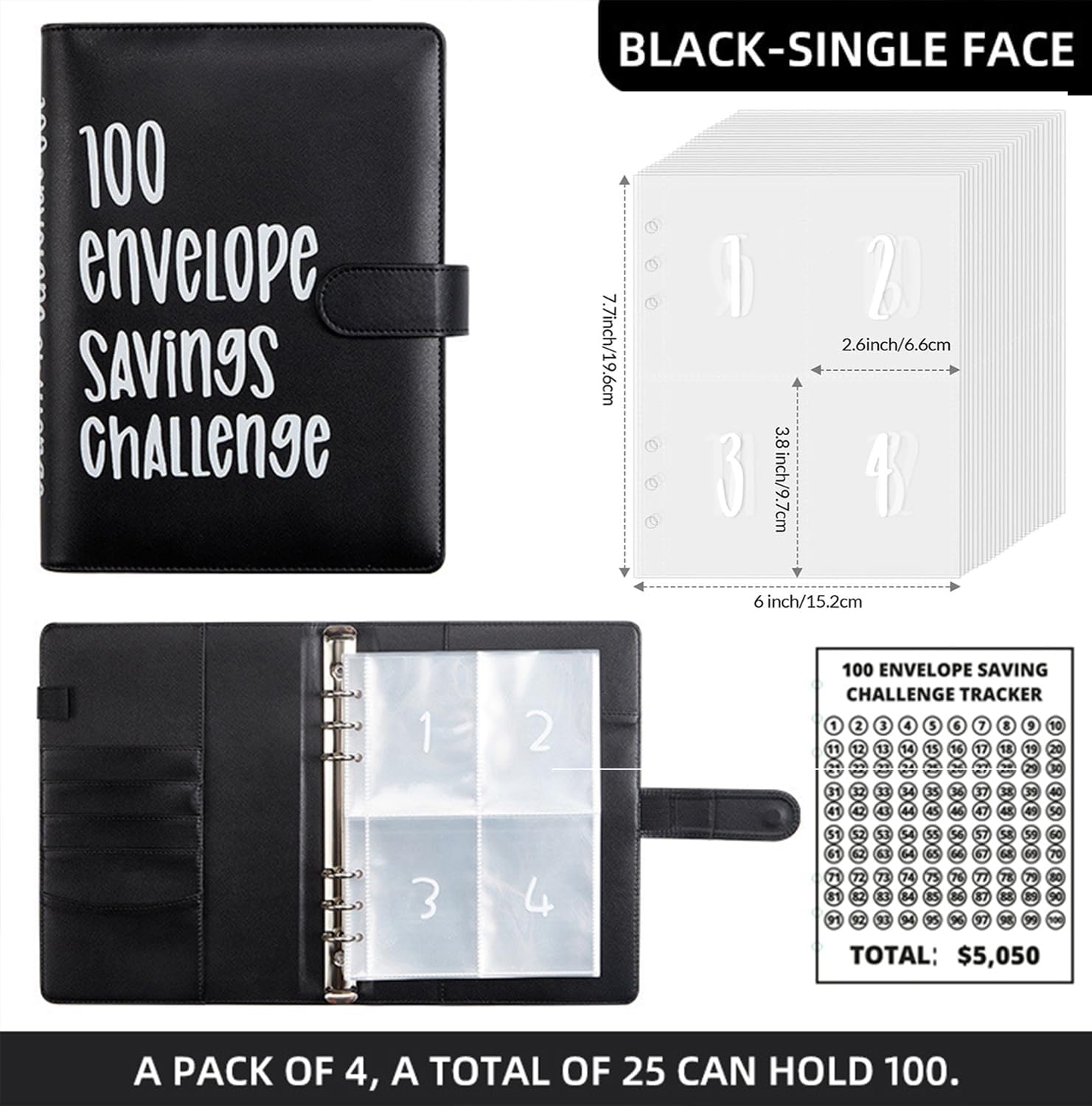 2PCS 100 Envelopes Money Saving Challenge, Envelopes Challenge Binder, Achieving Financial Goals with a Budget Binder and Cash Envelopes, Successfully Reach Your Savings Goals of $5,050 (Pink+Black)