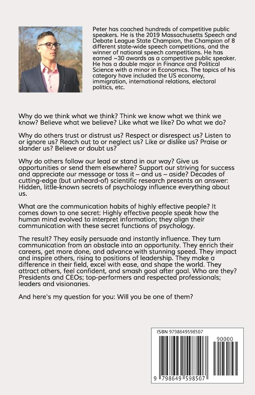 How to get more done with less effort by influencing others to support youHow to attract others (instead of turning them away and seeming unfriendly) with the correct type of body languageHow to make people systematically, predictably, and reliably overweigh your opinion by activating the availability biasHow to charge more or pay less (for the same product) and win every negotiation with the anchoring effectHow to effortlessly make others want something by activating one little-known cognitive bias (called “essential” by billionaire investor Charlie Munger, partner to Warren Buffet)How to lead with ease and reliably influence teams by using the contrast effectHow to effortlessly speak with memorable eloquence by applying 2,000-year-old secrets of powerful languageHow to ace every interview, meeting, and presentation with ease by activating agent detection biasHow to quickly diffuse all objections by activating the little-known (but extremely powerful) zero-risk biasHow to make people believe something even if they think the exact opposite with the illusory truth effectHow to appear authoritative, trustworthy, and capable in 10 seconds by activating the halo effectHow to combine the science of psychology with the art of communication and create a critical competitive advantage in life