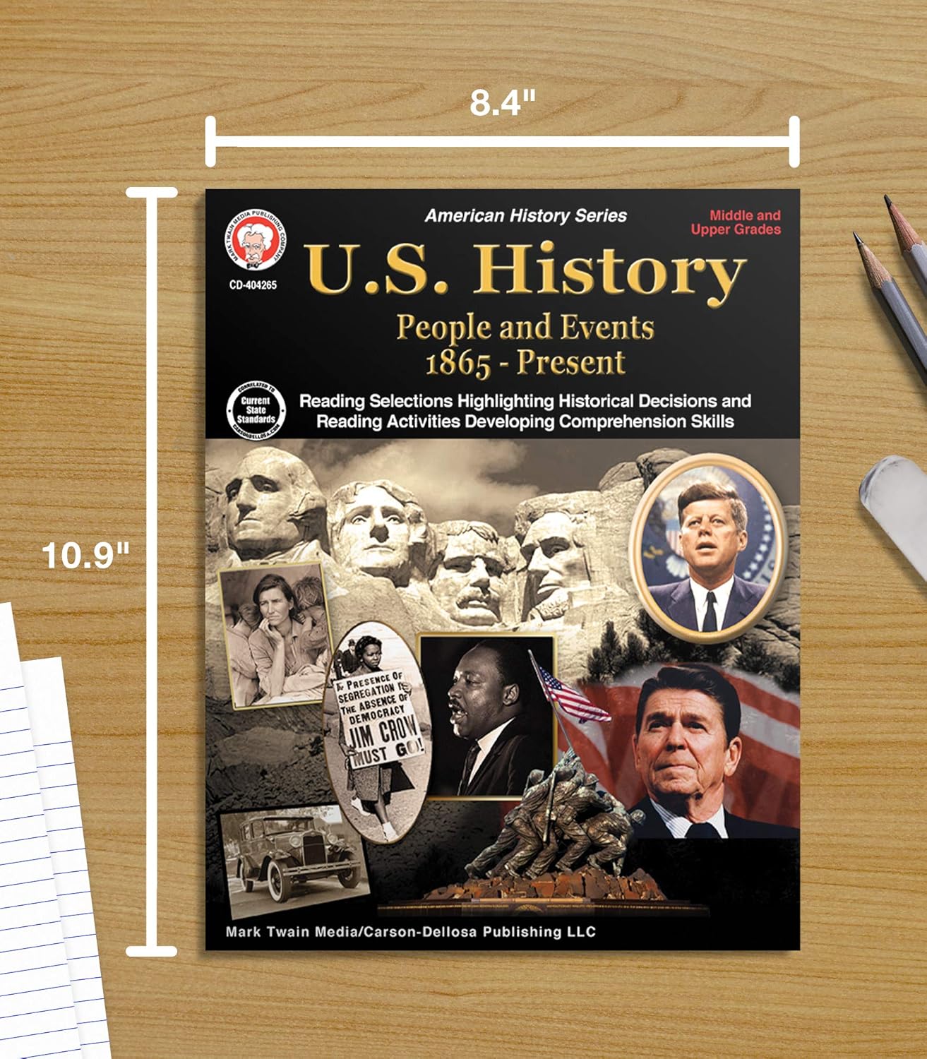 Engaging and educational history lessons and activities. World War I and World War II, the Civil Rights Movement, and US presidents are a few of the topics that are included in the workbook to help inspire learning in your child’s classroom or homeschool curriculum. Bonus online resources, extended reading suggestions, and a timeline of events are included for additional learning support.Tracking progress along the way. Activities, essays, and “challenge” problems are included to test student knowledge. Use the answer key in the back of the American history workbook to track your child’s progress before moving on to new lessons and topics.Practically sized for every activity. The 96-page workbook is sized at about 8” x 10 ½”―giving your child plenty of space to complete each exercise.