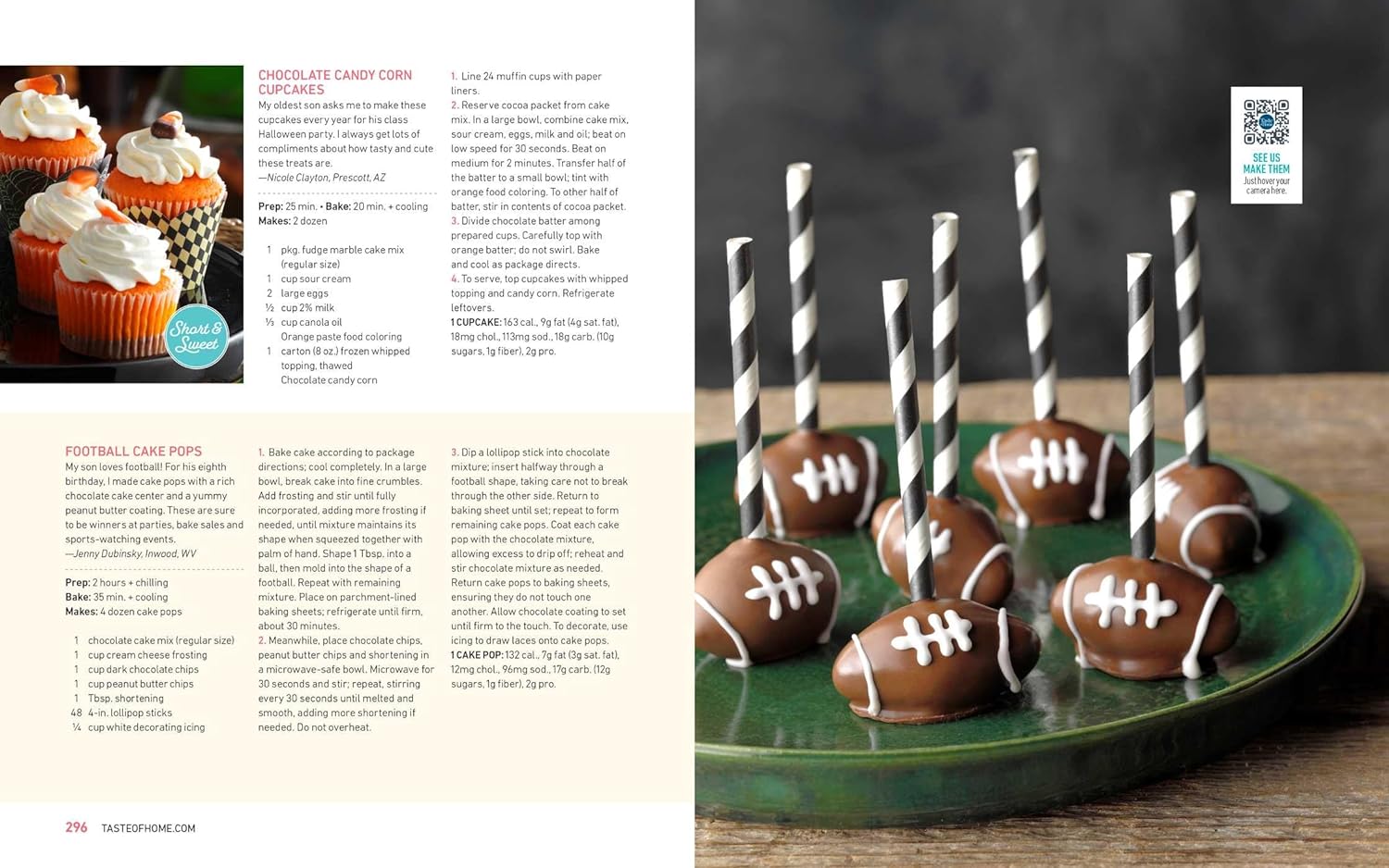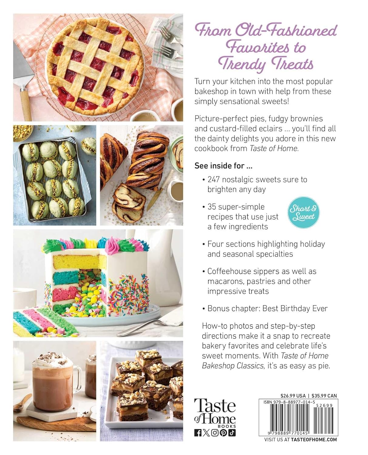 240+ FavoriteSweets. Discover the ultimate round-up of craveable treats, from macarons and smash cakes to vintage long johns and upside-down cakes.300 Gorgeous Color Photos. Find full-color photos and helpful step-by step preparation images throughout.Short & Sweet Icon. Dozens of shortcut dishes made easier with store-bought ingredients are highlighted with this at-a-glance icon.Best Birthday Cakes. This bonus chapter is brimming with dozens of sweet sensations for anyone’s big day! Ice cream cakes, birthday cake shooters, and even adorable children’s treats.Nostalgic Seasonal Sweets. Create new memories with your children as you revisit vintage Christmas candies, autumn’s best caramel apples in the fall and the fruity summer classics everyone adores.Café Beverages. Pumpkin Spice Latte, Chai Tea and Creamy Irish Coffee are just some of the coffeehouse specialties you’ll find here. Saving money and dazzling friends has never been easier!QR Codes. Simply scan the codes to watch the Taste of Home Test Kitchen staff put together some of the country’s most popular dishes. Bake with confidence as you follow their lead.Nutrition Facts with Every Recipe. Because it’s important to know what you’re serving family and friends, we’ve included a complete set of nutrition facts with every recipe, plus diabetic exchanges where applicable.