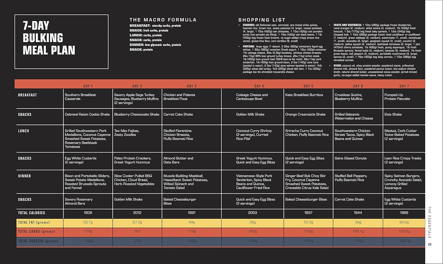 – 5 custom-designed meal plans for bulking and cutting phases, as well as plans for ketogenic dieting, calorie cycling, and carb cycling